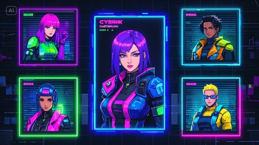 Framed character portraits in neon pixel edges